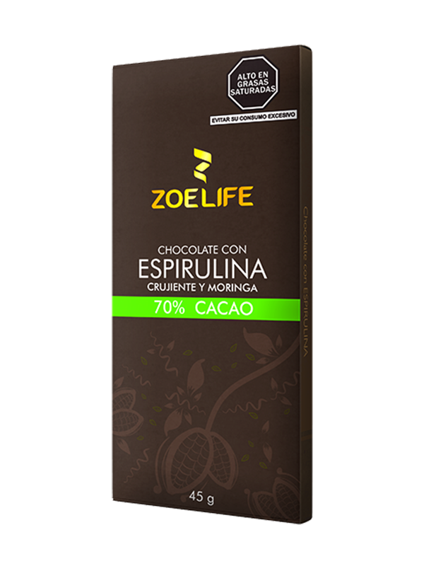A base de 70% de Cacao Moringa, espirulina y almendra.