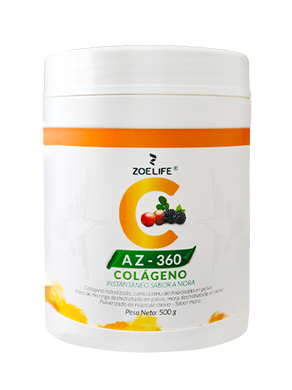 COLÁGENO AZ-360 de Zoe Life es una bebida en polvo funcional, formulada con colágeno hidrolizado, moringa, camu camu y extracto natural de mora. Aporta proteínas, antioxidantes y vitamina C de origen vegetal, ideal para quienes buscan verse bien, sentirse bien y nutrirse desde el interior.